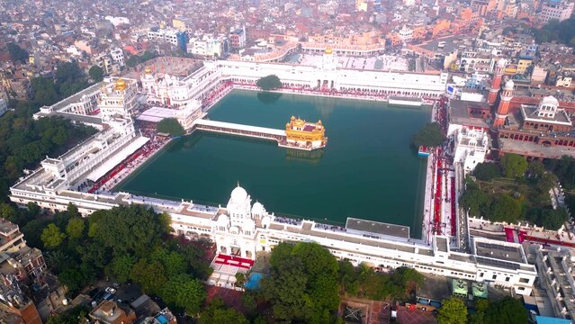 Aerial view of Sri Harimandir Darbar Sahib or Golden temple in Amritsar, Punjab, India