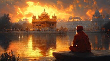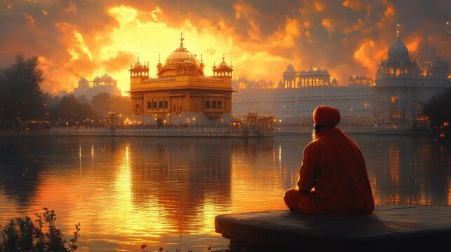 Golden Temple in Amritsar reflecting in the surrounding holy pond, with pilgrims around. Cartoon illustrations vectors Generative AI