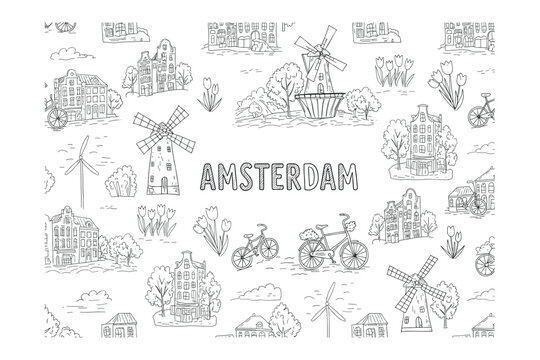 Exploring amsterdam's iconic windmills and architecture illustrated urban environment city view. Vector illustration