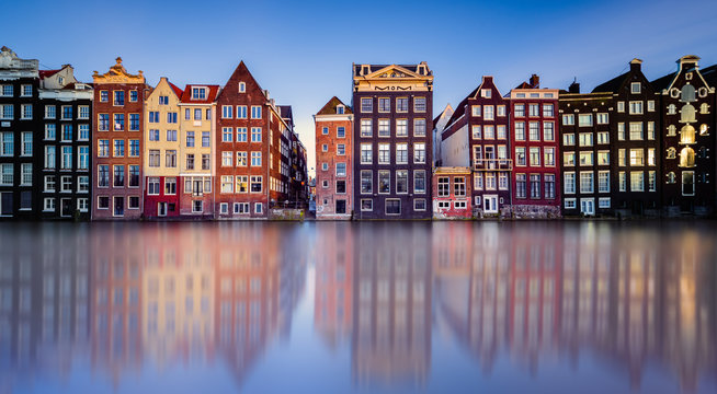 Amsterdam. Panoramic view of the downtown of Amsterdam.  A blue evening time and the serene reflection of lights in the water. Europe, Netherlands, Holland, Amsterdam.