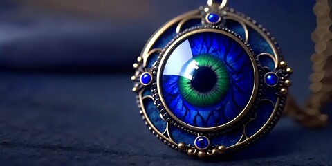 Ornate fantasy amulet featuring a mystical blue and green eye with a detailed iris.