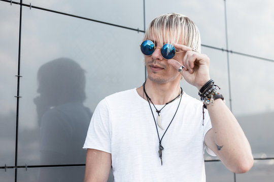 Cool hipster young man with a hairstyle in a fashionable white t-shirt with vintage amulets on a neck in trendy blue sunglasses poses near the modern wall in the city. Nice blond guy outdoors.