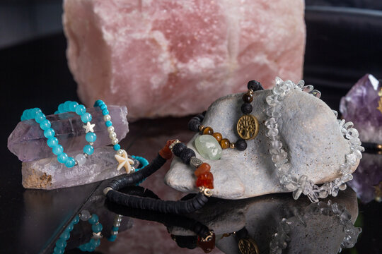 Quartz bracelets with amulets and pendants on rocks.