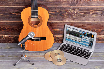 Musical equipment on wooden background. Acoustic guitar, microphone, laptop and cd disks on wooden background.
