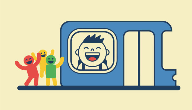 A student peeking out of the bus window with a wide grin as they watch their friends wave goodbye.