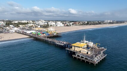 Santa Monica Pier In Los Angeles California United States. Breathtaking Aerial Landscape Of Famous Amusment Park. Paradise Landscape Idyllic Beauty. Summertime Idyllic Coast. Los Angeles California.