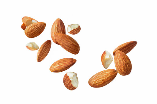 A clear plastic bag filled with whole almonds, sealed at the top, with a few almonds scattered on the reflective surface in front of it.