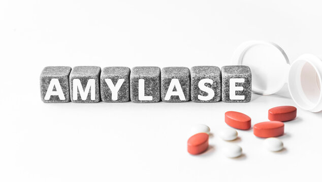 word AMYLASE is made of stone cubes on a white background with pills. medical concept of treatment, prevention and side effects. enzyme secreted by pancreas, breaks starch into sugar