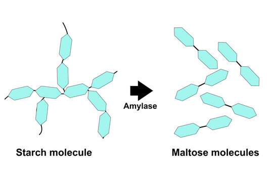Starch digestion. amylase enzyme effect on starch molecule
