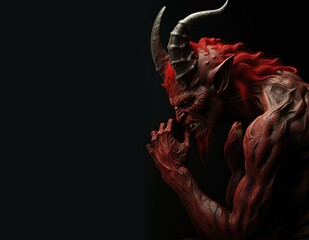 Long curly curvy goat horns. muscular. red skin. alien. Red devil, demon, Satan, belzebu. Black background. Sharp horns. Halloween concept. Hell, evil, bad.