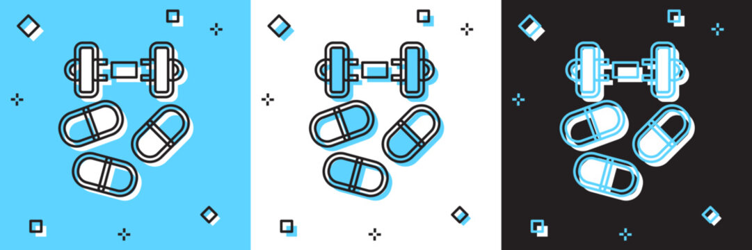 Set Sports doping, anabolic drugs with dumbbell icon isolated on blue and white, black background. Anabolic steroids tablet. Pills in jar. Vector