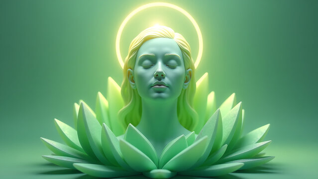 serene face meditates eyes closed surrounded halo soft light amidst intricate anahata kundalini crystal formation