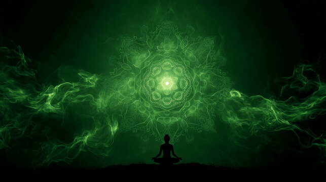 heart chakra meditation silhouette. activation of 4th chakra anahata with green lotus radiating light and smoke