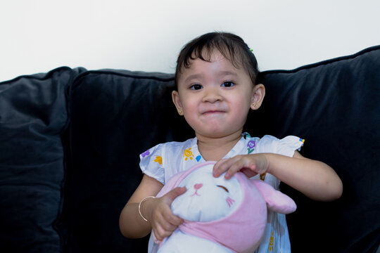 Happy cute toddler sitting on sofa, holding doll, facing camera in living room.