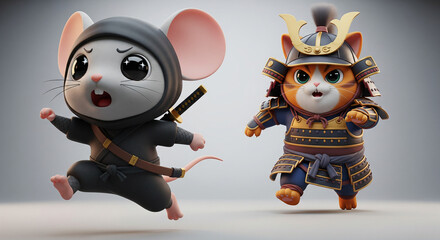 3d illustration of a ninja mouse being chased by a samurai cat.