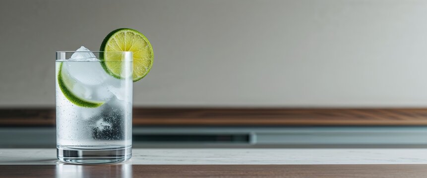 Refreshing gin and tonic with lime on a polished bar - sophisticated relaxation