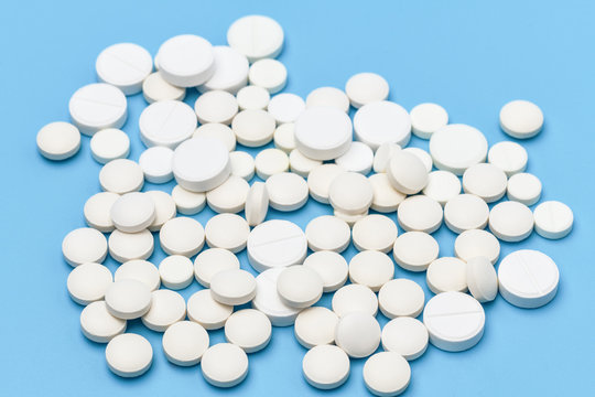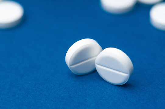 Lots of white pills on a blue background. Pills scattered on a blue background. Medical background. Health, Pharmacy.