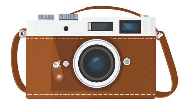 Retro camera sits on wooden table next to instant photos. Vintage camera with colorful stripes is analog device for capturing memories, offering nostalgic feel. Old school picture maker for snapshots.