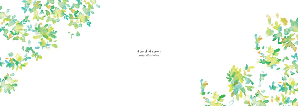 水彩画。水彩タッチの新緑ベクター背景。葉っぱが風に舞う新緑風景。緑の森とエコのイメージ。Watercolor painting. Fresh green vector background with watercolor touch. Fresh green landscape with leaves dancing in the wind. Green forest and ecologica