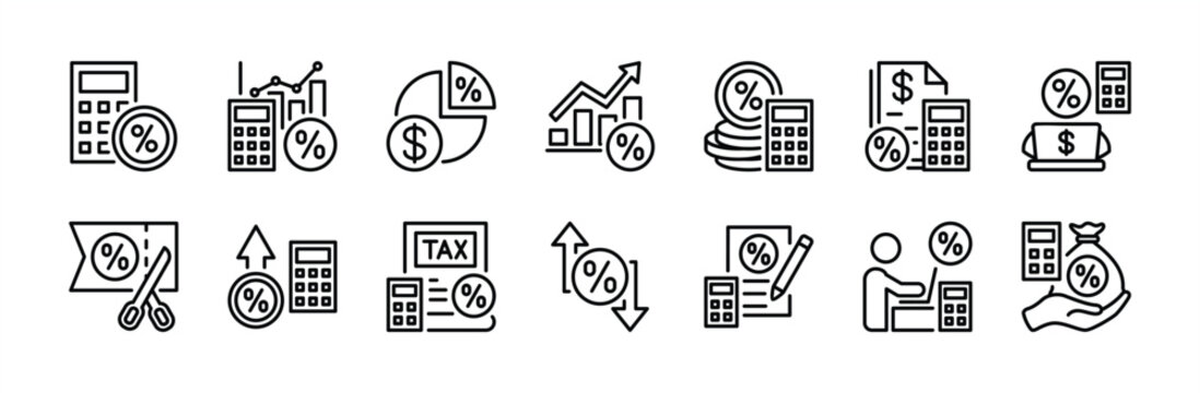 Tax calculation icon set. Financial document, count money, form, reports, payment, data analysis, income, amnesty, discount, currency, salary, chart up, accounting, refund - vector illustration