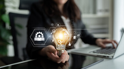A glowing light bulb surrounded by questions symbolizes inquiry and discovery.