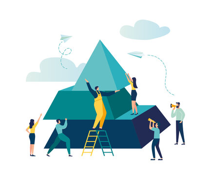 people connect the elements of the pyramid, vector illustration flat design style, symbol of teamwork, cooperation, partnership, advancement, pyramid puzzle