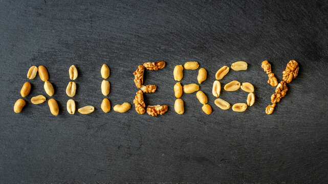 Nut allergy. The word ALLERGY is made up of various nuts. The concept of health. Immune system reaction, anaphylactic shock. Peanuts, Allergy symptoms and diagnosis. copy space, close up, flat lay