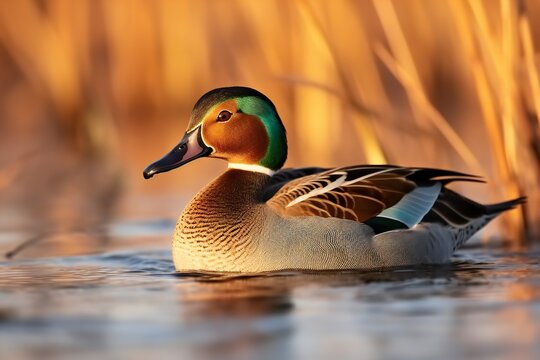 Garganey bird ( Spatula querquedula  ) in the first light, goldenhour.  Male garganey in natural environment at a small lake in spring. Orange sunlight