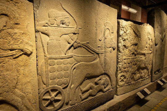 Ancient stone relief depicting Hittite warriors at the Museum of Anatolian Civilizations in Ankara, Turkey