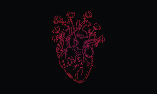 Romantic anatomic heart entwined with blooming flowers blossoming with love on a dark scene