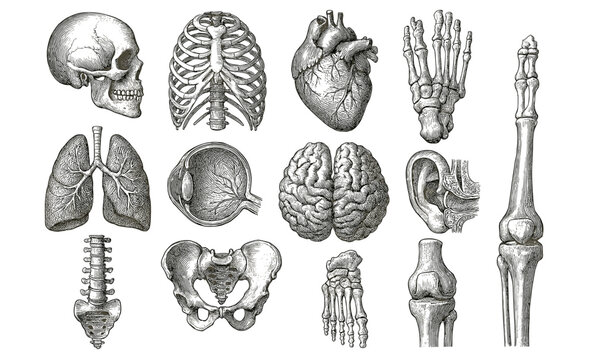 Detailed anatomical sketches of human organs and bones in vintage style