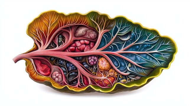Cross section of plant showing layers of chlorophyll rich tissue, vibrant green leaves, and intricate cellular structures