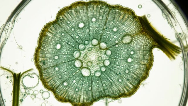 photorealistic cross section of plant stem showcasing intricate cellular structures and bubbles, highlighting beauty of nature design and complexity