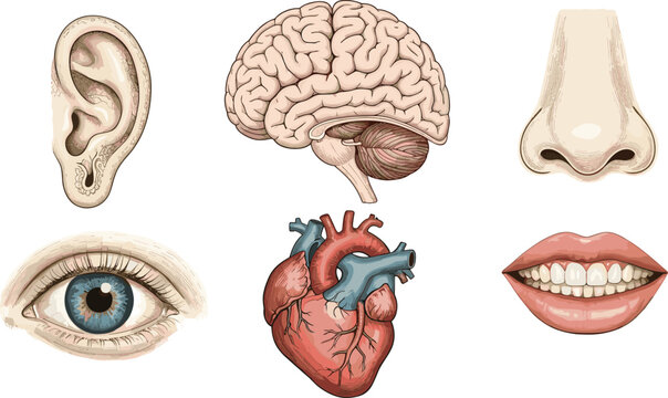 Detailed anatomical illustrations of human organs and senses, including brain, heart, eye, ear, nose, and mouth, ideal for medical education and healthcare designs
