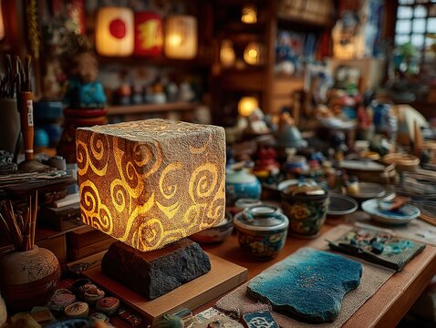Stone Base with Cloud-Patterned Light Cube on Wood Table - Feng Shui Illumination Art for Harmony & Ancestral Spirit