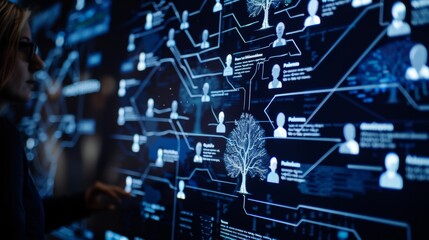 Businesswoman is analyzing a digital family tree displayed on a large interactive touchscreen. The tree is made of glowing lines and nodes representing people and their relationships