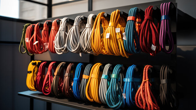 Multicolored climbing ropes for climbing in window of climbing equipment store