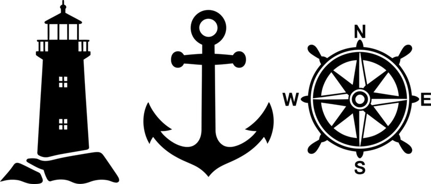 Nautical themed vector graphic featuring lighthouse anchor and ship wheel for marine and sailing concepts editable stock vector illustration