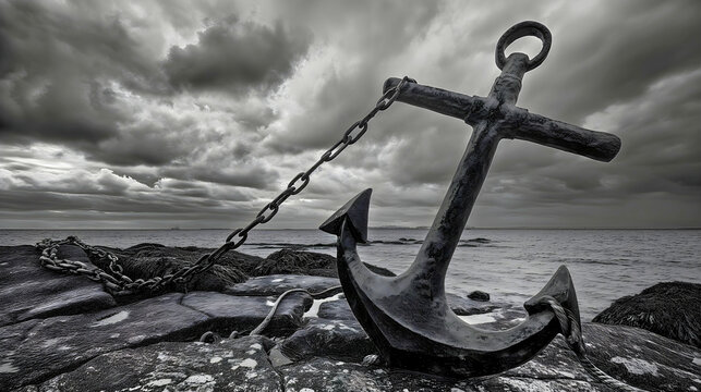 A large marine anchor made of pure steel, held by steel cables; this anchor is used for anchoring ships.