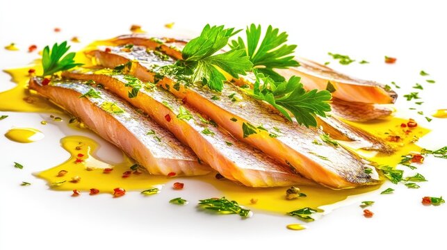Savory marinated anchovies with parsley olive oil and vinegar on a white background