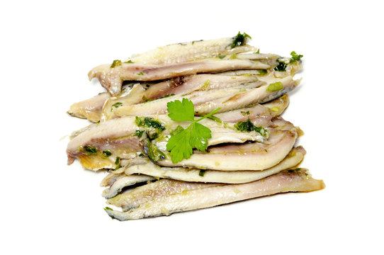 Delicious Marinated anchovies with parsley, olive oil and vinegar isolated on white background.