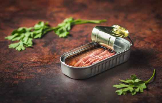 Canned anchovies open on a dark brown table with parsley. Ready for eat.