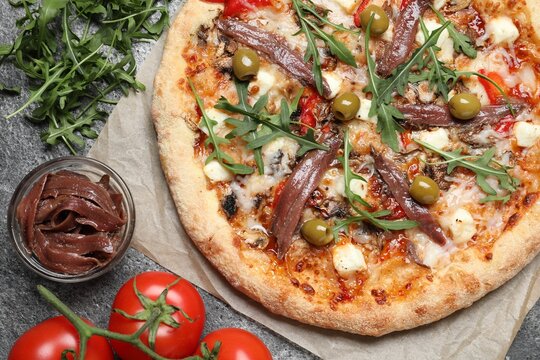 Tasty pizza with anchovies and ingredients on grey table, flat lay