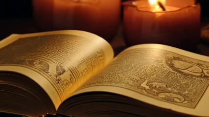 background lit dark surrounded ancient book Open candles candle mysticism spirituality page old antique vintage wisdom cognition light glow reading literature text manuscript history tradition religi