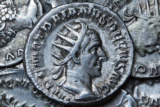 Ancient Roman silver coin with portrait of emperor