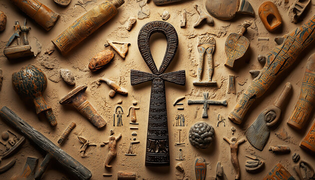 An ankh surrounding by ancient artifacts.  Generative AI.