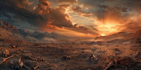 A dry desert valley with piles of the bones of an ancient army in the foreground