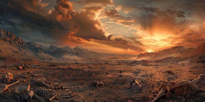 A dry desert valley with piles of the bones of an ancient army in the foreground. Discarded swords and shields litter the floor. Generative AI.