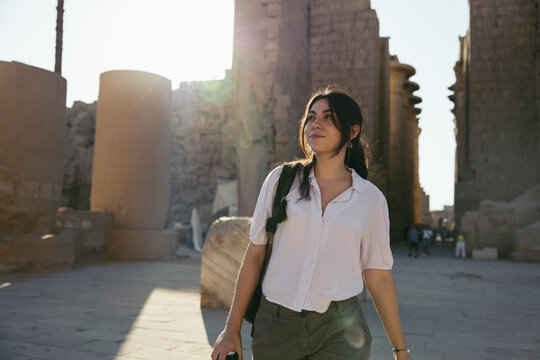 Backpacker woman at the Karnak Temple (Luxor, Egypt).