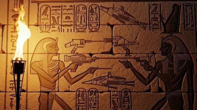 Torchlight illuminates ancient Egyptian hieroglyphs depicting man and woman holding futuristic firearms, alien technology concept footage.